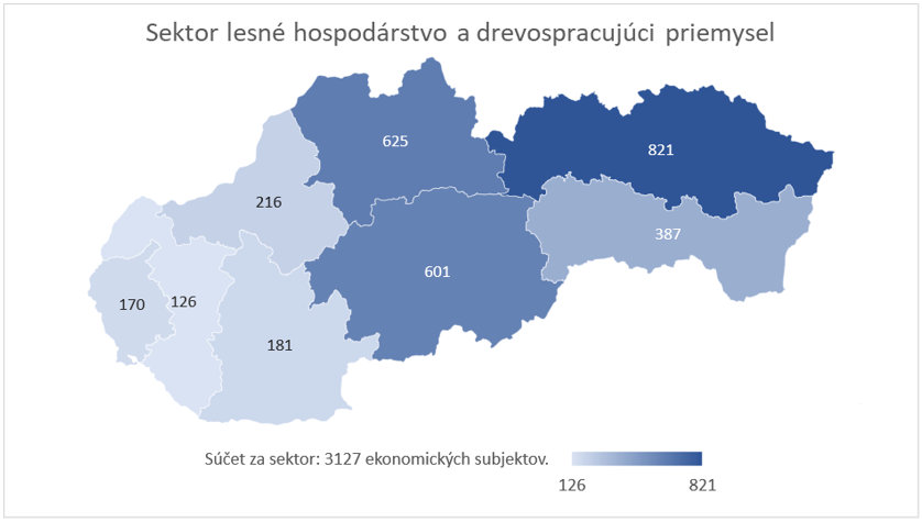 V priebehu ukončeného kalendárneho roku 2021 vzniklo v sektore lesné hospodárstvo a drevospracujúci priemysel v rámci celej SR približne 3 130 ekonomických subjektov. Rozhodnutie o založení nového subjektu bolo koncentrované najmä v rámci Prešovského, Žilinského a Banskobystrického kraja. Tieto regióny boli charakteristické približne 26 %-ným, resp. cca 20 %-ným zastúpením na celkovom počte ekonomických subjektov, ktoré vznikli v SR v sektore lesné hospodárstvo a drevospracujúci priemysel v roku 2021. Medzi regiónmi v rámci SR najnižšie podiely na dynamike vzniku sektorovo špecifických ekonomických subjektov vykázali Trnavský a Bratislavský kraj, a to s početnosťou približne 130, resp. 170 novovzniknutých subjektov.