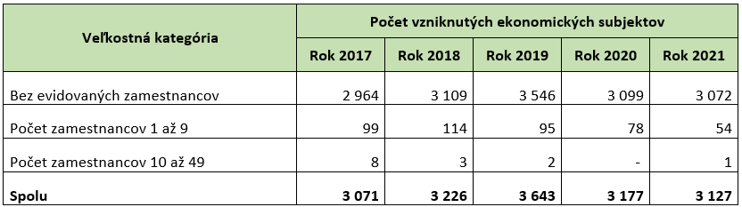 Z aspektu kombinácie časového (kalendárny rok) a veľkostného hľadiska (počet zamestnancov) vzniku ekonomických subjektov v období rokov 2017 až 2021 pribudlo v sektore najviac trhových aktérov v strede sledovaného obdobia, (t. j. v roku 2019) vo veľkostnej kategórii bez evidovaných zamestnancov, a to približne 3 550 ekonomických subjektov. Výrazný vznik ekonomických subjektov v tejto veľkostnej kategórii bol v rámci sektora zaznamenaný aj v roku 2018, a to približne 3 110 subjektov. Naopak, najnižšou dynamikou sa vyznačovali roky 2017 a 2021.