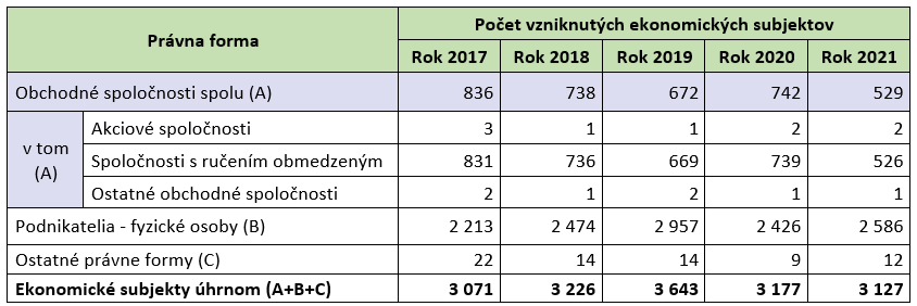 Z pohľadu kombinácie časového (kalendárny rok) a vecného hľadiska (právna forma) vzniku ekonomických subjektov v rokoch 2017 až 2021 vznikol najvyšší počet (a to až 2 960 ekonomických subjektov) v roku 2019 prostredníctvom podnikateľov-fyzických osôb. Druhá najvyššia intenzita vzniku nových ekonomických subjektov, a to na úrovni približne 2 590 ekonomických subjektov, bola v lesnom hospodárstve a drevospracujúcom priemysle zaznamenaná v tejto právnej forme podnikania vo vlastnom mene a na vlastnú zodpovednosť v roku 2021. Obchodných spoločností vzniklo najviac v roku 2017 (a to 840 subjektov), pričom takmer všetky boli spoločnosti s ručením obmedzeným.