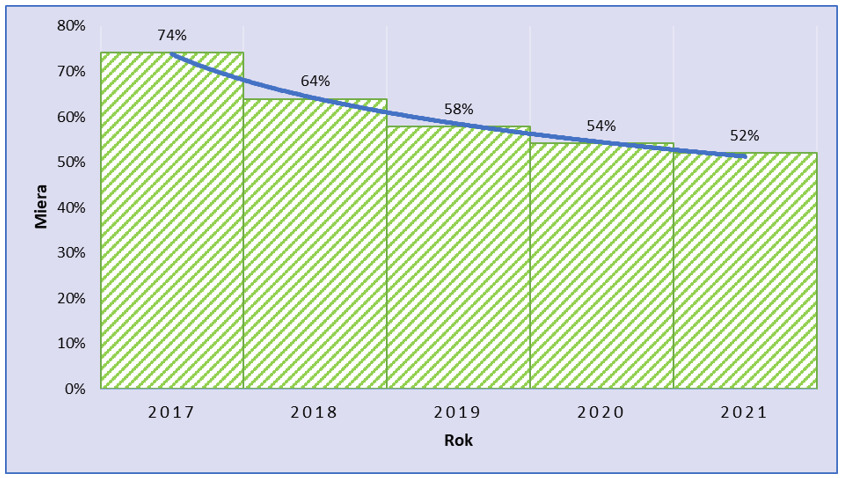 Zo všetkých ekonomických subjektov (t. j. 100 %), ktoré vznikli v sektore lesné hospodárstvo a drevospracujúci priemysel v roku 2017, ich približne 74 % pôsobilo na trhu aj ku koncu roku 2017, t. j. k 31. 12. 2017. Čiže približne 26 % ekonomických subjektov, ktoré vznikli v roku 2017, ukončilo svoju činnosť ešte do konca roku 2017 (rok 2017 bol súčasne rokom ich vzniku aj zániku). Z ekonomických subjektov, ktoré vznikli v sektore lesné hospodárstvo a drevospracujúci priemysel v roku 2017, ich naďalej aj ku koncu roku 2018, t. j. k 31. 12. 2018, pôsobilo približne 64 %. Ku koncu roku 2019 aj naďalej pôsobilo približne 58 % ekonomických subjektov, ktoré vznikli v sektore v roku 2017. Postupne miera prežitia ekonomických subjektov dosiahla 54 % v roku 2020 a 52 % v roku 2021. Na základe rozboru vývoja v náročnom období rokov 2017 až 2021 tak možno vyvodiť sektorovo špecifický záver, že zo 100 ekonomických subjektov vzniknutých v rámci sektora lesné hospodárstvo a drevospracujúci priemysel v roku 2017, ich 52 naďalej pôsobilo aj k 31. 12. 2021.