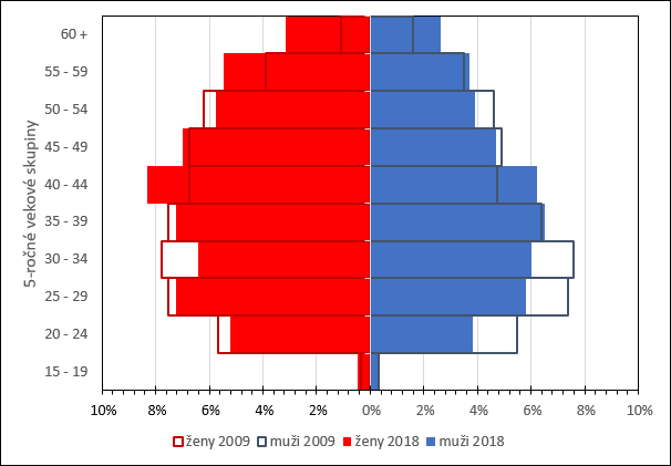 Porovnanie vekovej pyramídy mužov a žien zamestnaných v rámci sektora obchod, marketing, gastronómia a cestovný ruch za roky 2009 a 2018