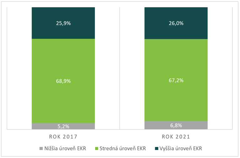 Počas uplynulých piatich rokov, t. j. medzi rokmi 2017 a 2021, najvýraznejšia zmena v štruktúre sektorovo špecifických zamestnancov nastala na strednej úrovni EKR, kde prišlo k zníženiu podielu sektorovo špecifických zamestnancov o cca 1,7 p. b. Na druhej strane, podiel zamestnancov s nižšou úrovňou EKR sa zvýšil o 1,6 p. b.