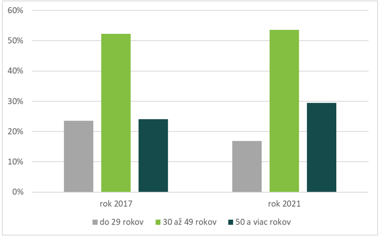Podielovo najvýraznejšou skupinou zamestnancov v sektore obchod, marketing, gastronómia a cestovný ruch za rok 2021 boli zamestnanci vo veku 30 až 49 rokov. Ich podiel na celkovom počte sektorovo špecifických zamestnancov predstavoval cca 53,6 %, čo oproti roku 2017 predstavovalo zvýšenie o cca 1,3 p. b. Druhá najväčšia skupina zamestnancov tohto sektora bola vo vekovej skupine 50 a viac rokov, ich podiel bol rastúci a v roku 2021 predstavoval 29,5 %. Podiel najmladšej skupiny zamestnancov, t. j. do 29 rokov veku, bol najnižší. Zníženie medzi rokmi 2017 a 2021 dosiahlo 6,7 p. b., a to na konečných 16,9 %.