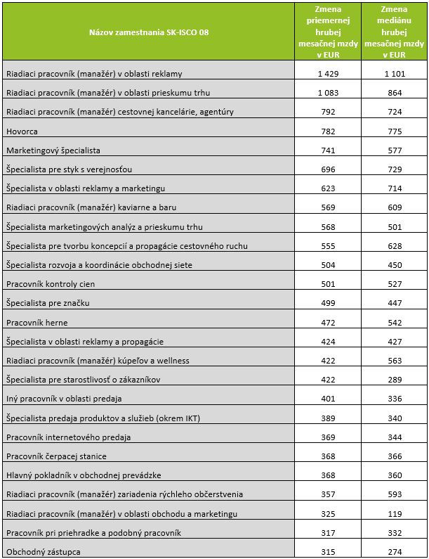 Z hľadiska zmeny mediánu hrubej mesačnej mzdy v peňažných jednotkách, t. j. v EUR, nastalo počas sledovaného obdobia v sektore obchod, marketing, gastronómia a cestovný ruch najvýraznejšie zvýšenie mzdy v zamestnaní Riadiaci pracovník (manažér) v oblasti reklamy, a to o 1 101 EUR. Za ním nasledovalo zamestnanie Riadiaci pracovník (manažér) v oblasti prieskumu trhu, kde zvýšenie medzi rokmi 2017 a 2021 predstavovalo 864 EUR. Mzdový nárast vo výške 775 EUR bol identifikovaný v sektorovo špecifickom zamestnaní Hovorca. V zamestnaní Špecialista pre styk s verejnosťou išlo o 729 EUR.