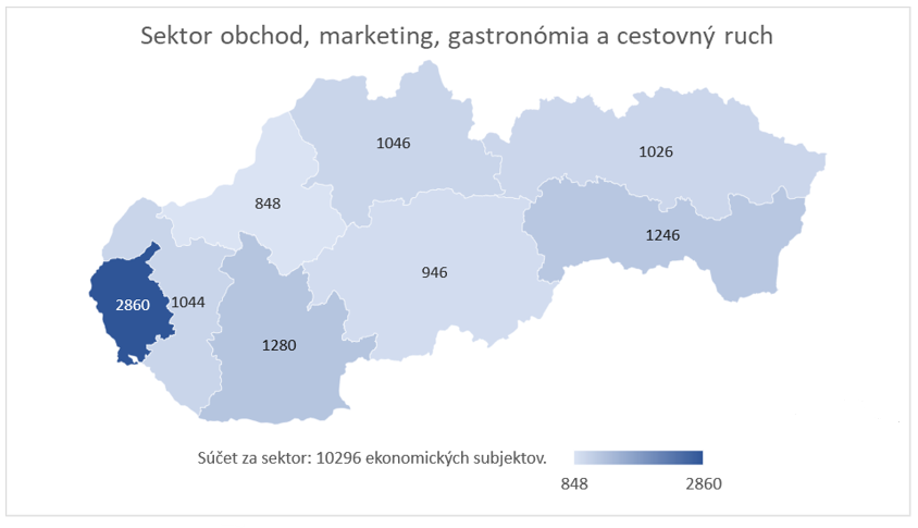 V priebehu ukončeného kalendárneho roku 2021 vzniklo v sektore obchod, marketing, gastronómia a cestovný ruch v rámci celej SR približne 10 300 ekonomických subjektov. Rozhodnutie o založení nového subjektu bolo koncentrované najmä v rámci Bratislavského, Nitrianskeho a Košického kraja. Tieto regióny boli charakteristické približne 28 %-ným, resp. 12 %-ným zastúpením na celkovom počte ekonomických subjektov, ktoré vznikli v SR v sektore obchod, marketing, gastronómia a cestovný ruch v roku 2021. Medzi regiónmi najnižšie podiely na vzniku sektorovo špecifických ekonomických subjektov vykázali v rámci SR Trenčiansky kraj a Banskobystrický kraj, a to s početnosťou približne 850, resp. 950 novovzniknutých subjektov.