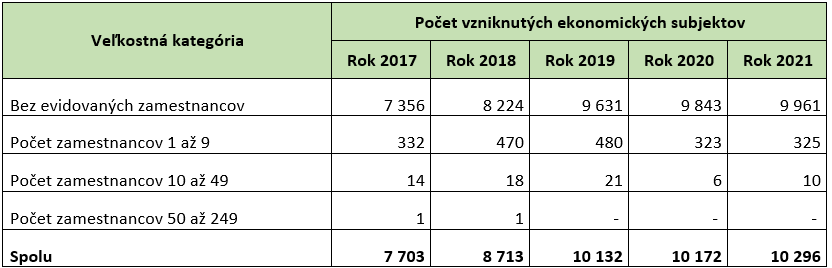 Z aspektu kombinácie časového (kalendárny rok) a veľkostného hľadiska (počet zamestnancov) vzniku ekonomických subjektov v období rokov 2017 až 2021 pribudlo v sektore najviac trhových aktérov na konci sledovaného obdobia, (t. j. v roku 2021) vo veľkostnej kategórii bez evidovaných zamestnancov, a to približne 9 960 ekonomických subjektov. Výrazný vznik ekonomických subjektov v tejto veľkostnej kategórii bol v rámci sektora zaznamenaný aj v roku 2020, a to približne 9 840 ekonomických subjektov. Naopak, najnižšou dynamikou sa vyznačovali roky 2017 a 2018.