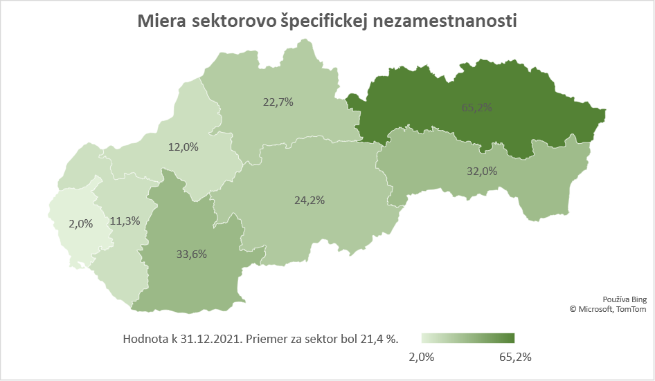 Miera sektorovo špecifickej nezamestnanosti bola v troch krajoch SR vyššia, ako bola jej celoštátna priemerná hodnota v rámci sektora, pričom situáciu v krajoch ovplyvnila taktiež návratová mobilita osôb, ktoré boli z práce uvoľnené v inom regióne, vrátane zahraničia. V poľnohospodárstve, veterinárstve a rybolove bola najvýraznejšia miera sektorovo špecifickej nezamestnanosti k 31. 12. 2021 zaznamenaná v Košickom kraji, kde dosiahla približne 29 %. Jej druhá najvyššia hodnota bola v Banskobystrickom kraji, a to viac ako 26 %. V opačnom spektre sa nachádzal Bratislavský kraj, kde bola najnižšia miera sektorovo špecifickej nezamestnanosti, a to necelých 8 %. Vzhľadom k charakteru zastavaného územia bolo v Bratislavskom kraji v poľnohospodárstve, veterinárstve a rybolove málo sektorovo špecifických zamestnancov, čo je taktiež zohľadnené v metodike výpočtu miery sektorovo špecifickej nezamestnanosti. Nízka hodnota sledovaného ukazovateľa bola aj v Trnavskom kraji, a to necelých 9 %. Celoštátny priemer úspešne vylepšoval aj Trenčiansky kraj, a to s hodnotou necelých 11 %.