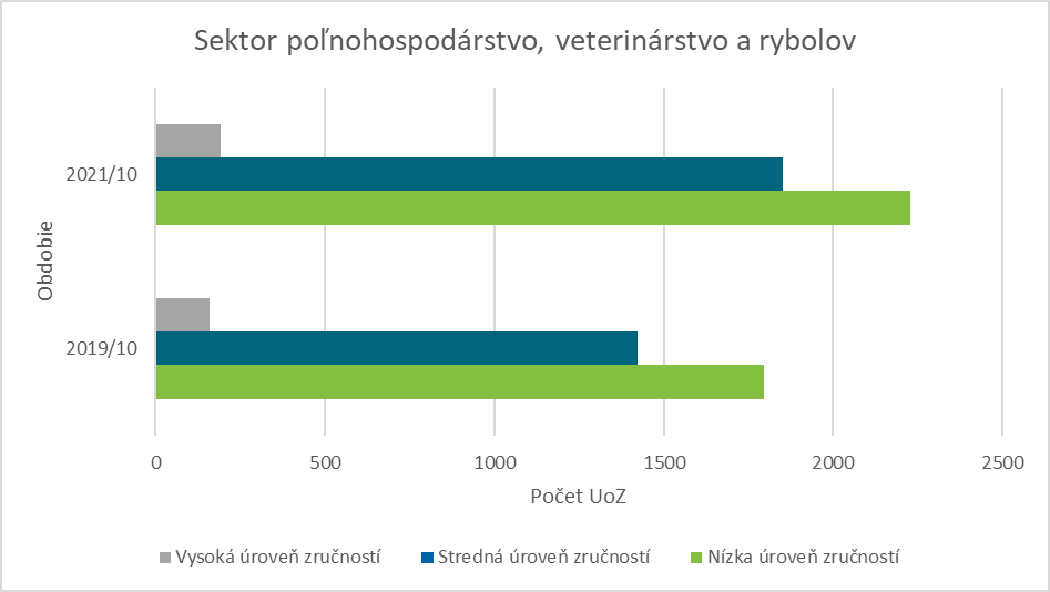 Počet UoZ s predchádzajúcim vykonávaným zamestnaním typickým pre sektor poľnohospodárstvo, veterinárstvo a rybolov pod vplyvom pandémie COVID-19 od 31. 10. 2019 do 31. 10. 2021 vzrástol približne o 900 osôb, t. j. o 27 %. Sektorovo špecifickí zamestnanci v poľnohospodárstve, veterinárstve a rybolove vykonávali prevažne pracovné činnosti vyžadujúce strednú úroveň zručností, avšak najvyšší počet sektorovo špecifických UoZ vykonával bezprostredne pred zaradením do evidencie UoZ zamestnania, ktoré si vyžadovali iba nízku úroveň zručností. Z celkového počtu sektorovo špecifických UoZ ich bolo približne 52 %. Najmenej sektorovo špecifických UoZ bolo s predchádzajúcou praxou na vysokej úrovni zručností, a to iba necelých 5 %.