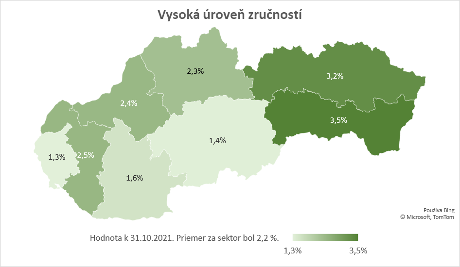 Miera sektorovo špecifickej nezamestnanosti na vysokej úrovni zručností v sektore poľnohospodárstvo, veterinárstvo a rybolov v regionálnom členení podľa krajov v SR k 31. 10. 2021
