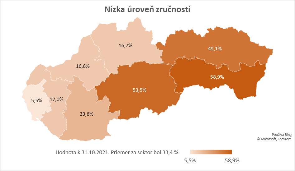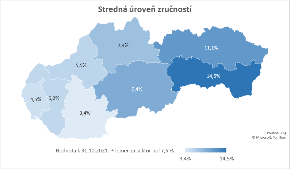 Miera sektorovo špecifickej nezamestnanosti na nízkej úrovni zručností v sektore poľnohospodárstvo, veterinárstvo a rybolov v regionálnom členení podľa krajov v SR k 31. 10. 2021