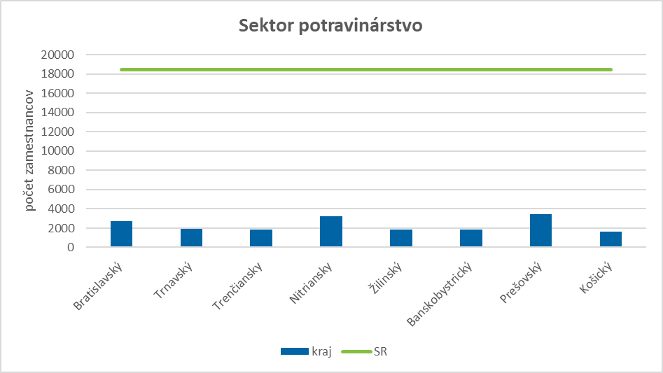 Sektor potravinárstvo sa svojou veľkosťou radí medzi menšie sektory. K 31. 12. 2021 tvorili sektorovo špecifickí zamestnanci približne 1,5 %-ný podiel na úhrnnej zamestnanosti za všetky sektory SRI, pričom v pandemickom období od 31. 12. 2019 do 31. 12. 2021 bol zaznamenaný mierny pokles. Osobitosti sektorovo špecifickej zamestnanosti z hľadiska regiónov SR prezentuje nasledujúci graf.