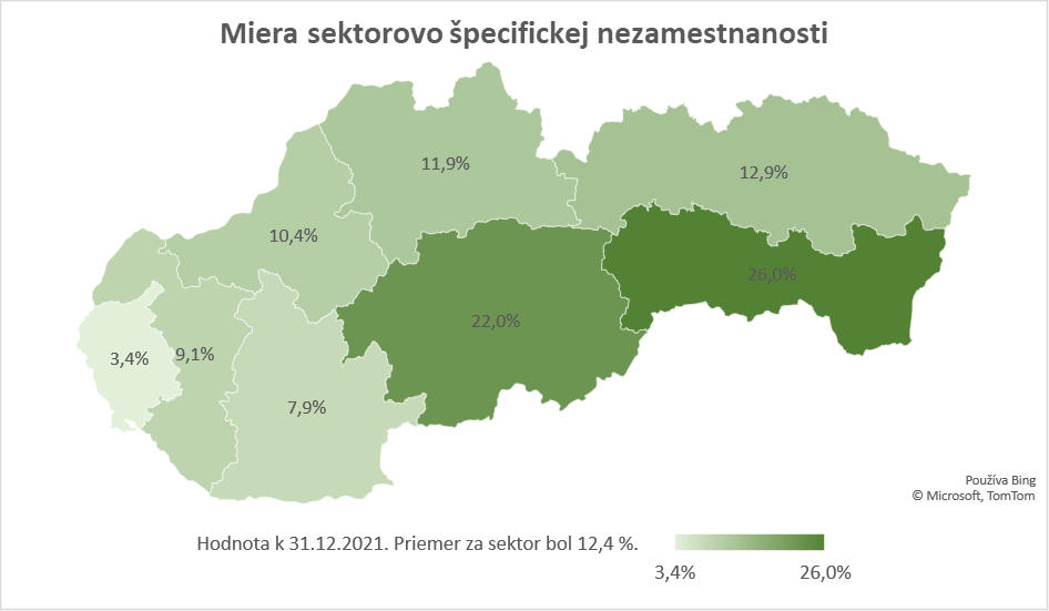 Miera sektorovo špecifickej nezamestnanosti bola v troch krajoch SR vyššia, ako bola jej celoštátna priemerná hodnota v rámci sektora, pričom situáciu v krajoch ovplyvnila taktiež návratová mobilita osôb, ktoré boli z práce uvoľnené v inom regióne, vrátane zahraničia. V potravinárstve bola najvýraznejšia miera sektorovo špecifickej nezamestnanosti k 31. 12. 2021 zaznamenaná v Košickom kraji, kde dosiahla približne 26 %. Jej druhá najvyššia hodnota bola v Banskobystrickom kraji, a to 22 %. V opačnom spektre sa nachádzal Bratislavský kraj, kde bola najnižšia miera sektorovo špecifickej nezamestnanosti, a to cca 3 %. Nízka hodnota sledovaného ukazovateľa bola aj v Nitrianskom kraji, a to necelých 8 %. Celoštátny priemer úspešne vylepšoval aj Trnavský kraj, a to s hodnotou cca 9 %.