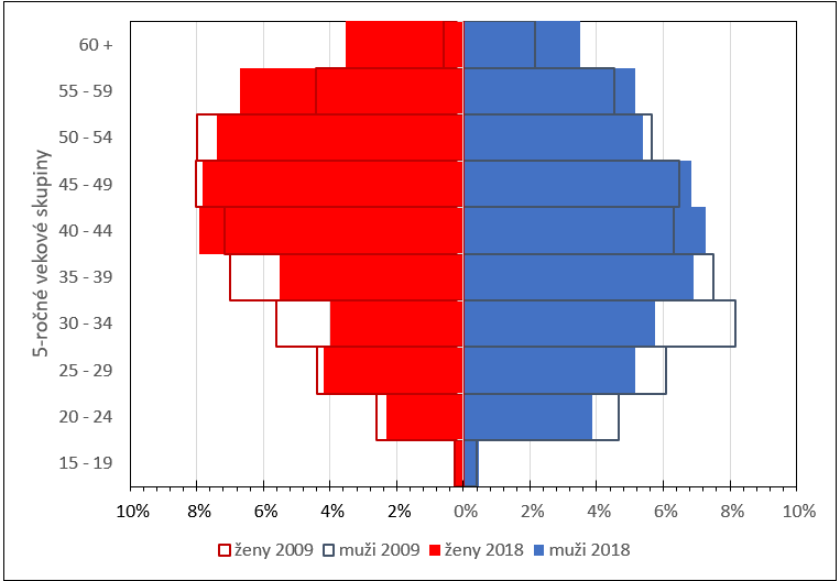 Porovnanie vekovej pyramídy mužov a žien zamestnaných v rámci sektora potravinárstvo za roky 2009 a 2018