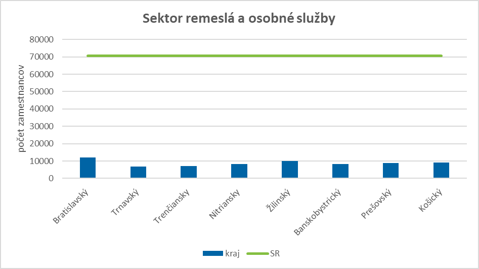 Sektor remeslá a osobné služby bol charakteristický približne 17 %-ným (viac ako 12 000 osôb) zastúpením Bratislavského kraja na celkovom počte sektorovo špecifických zamestnancov v SR. Približne 14 % sektorovo špecifických pracovných príležitostí sa využilo v Žilinskom kraji. Medzi regiónmi najnižší podiel sektorovo špecifických zamestnancov vykázal k 31. 12. 2021 Trnavský kraj, a to cca 9 % z úhrnného počtu sektorovo špecifických zamestnancov.