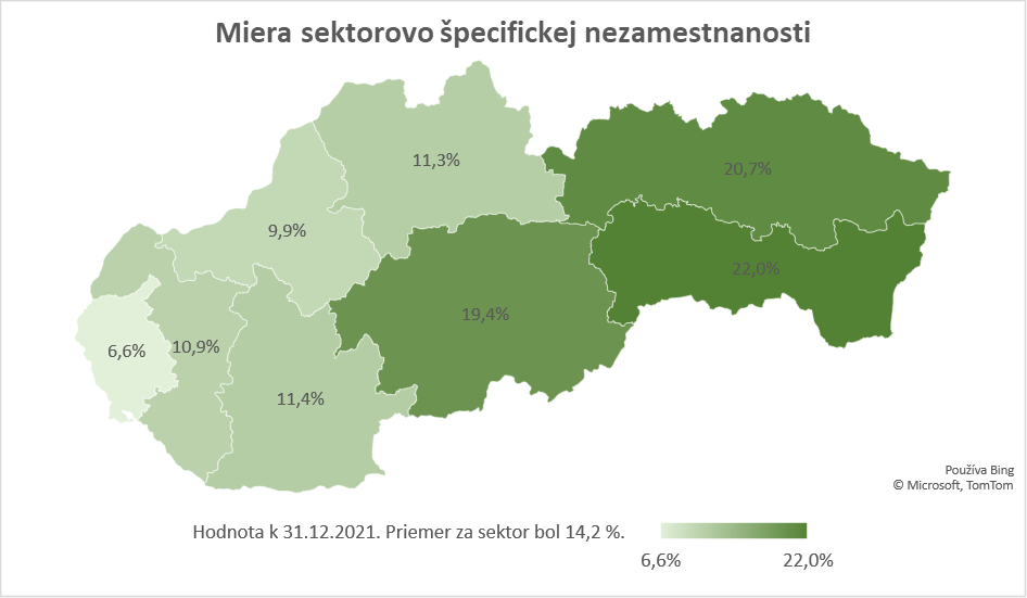 Miera sektorovo špecifickej nezamestnanosti bola v troch krajoch SR vyššia, ako bola jej celoštátna priemerná hodnota v rámci sektora (cca 14 %), pričom situáciu v krajoch ovplyvnila taktiež návratová mobilita osôb, ktoré boli z práce uvoľnené v inom regióne, vrátane zahraničia. Návrat zo zahraničia bol osobitným dôvodom zvýšenia počtu sektorovo špecifických UoZ aj v niektorých činnostiach remesiel a osobných služieb, ktoré zaznamenali zvýšenie vnútroštátneho dopytu po kvalifikovaných ľudských zdrojoch. V sektore bola najvýraznejšia miera sektorovo špecifickej nezamestnanosti k 31. 12. 2021 zaznamenaná v Košickom kraji, kde dosiahla približne 22 %. V opačnom spektre sa nachádzal Bratislavský kraj, kde bola zaznamenaná miera sektorovo špecifickej nezamestnanosti na úrovni menej ako 7 %.