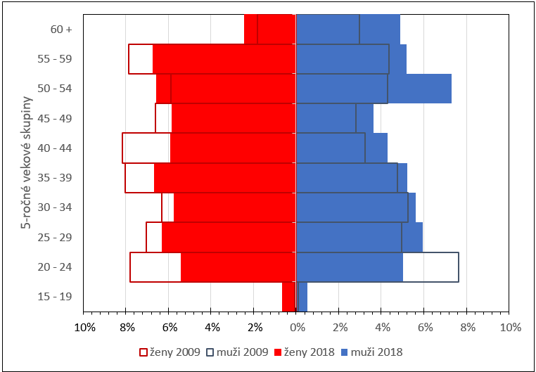 Porovnanie vekovej pyramídy mužov a žien zamestnaných v rámci sektora remeslá a osobné služby za roky 2009 a 2018