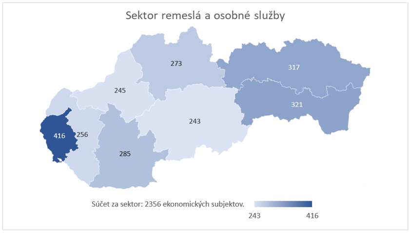 V priebehu ukončeného kalendárneho roku 2021 vzniklo v sektore remeslá a osobné služby v rámci celej SR približne 2 360 ekonomických subjektov. Rozhodnutie o založení nového subjektu bolo koncentrované najmä v rámci Bratislavského, Košického a Prešovského kraja. Tieto regióny boli charakteristické približne 18 %-ným, resp. 14 %-ným zastúpením na celkovom počte ekonomických subjektov, ktoré vznikli v SR v sektore remeslá a osobné služby v roku 2021. Medzi regiónmi najnižšie podiely na vzniku sektorovo špecifických ekonomických subjektov v krajskej štruktúre SR vykázali Banskobystrický a Trenčiansky kraj, a to s početnosťou približne 240, resp. 250 novovzniknutých subjektov.