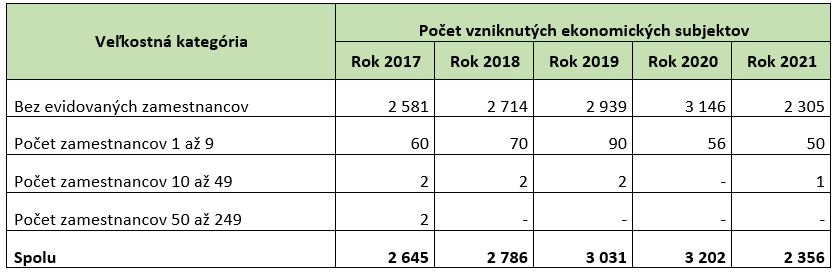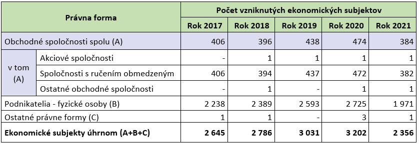 Z pohľadu kombinácie časového (kalendárny rok) a vecného hľadiska (právna forma) vzniku ekonomických subjektov v rokoch 2017 až 2021 vznikol najvyšší počet (a to cca 2 730 ekonomických subjektov) v roku 2020 prostredníctvom podnikateľov-fyzických osôb. Mierne nižšia intenzita vzniku ekonomických subjektov (cca 2 590 ekonomických subjektov) v remeslách a osobných službách bola zaznamenaná v tejto právnej forme podnikania vo vlastnom mene a na vlastnú zodpovednosť v roku 2019. Obchodných spoločností vzniklo najviac v roku 2020 (a to cca 470 subjektov), z toho takmer všetky boli spoločnosti s ručením obmedzeným.