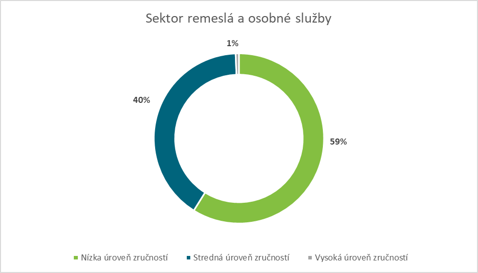 Sektor remeslá a osobné služby bol charakteristický približne 59 %-ným zastúpením sektorovo špecifických zamestnancov uplatňujúcich na pracovných miestach nízku úroveň zručností. Približne 40 % sektorovo špecifických pracovných príležitostí si vyžadovalo strednú úroveň zručností a vysokú úroveň zručností uplatňovalo približne 1 % sektorovo špecifických zamestnancov.