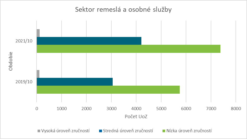 Počet UoZ s predchádzajúcim vykonávaným zamestnaním typickým pre sektor remeslá a osobné služby pod vplyvom pandémie COVID-19 od 31. 10. 2019 do 31. 10. 2021 vzrástol cca o 2 800 osôb, t. j. približne o 31 %. Sektorovo špecifickí zamestnanci vykonávali prevažne pracovné činnosti vyžadujúce nízku úroveň zručností a taktiež najvyšší počet sektorovo špecifických UoZ vykonával bezprostredne pred zaradením do evidencie UoZ zamestnania, ktoré si vyžadovali túto zručnostnú úroveň. Z celkového počtu sektorovo špecifických UoZ ich bolo približne 63 %. Najmenej sektorovo špecifických UoZ bolo s predchádzajúcou praxou na vysokej úrovni zručností, a to iba 1 %. Na strednej úrovni zručností išlo približne o 35 %.