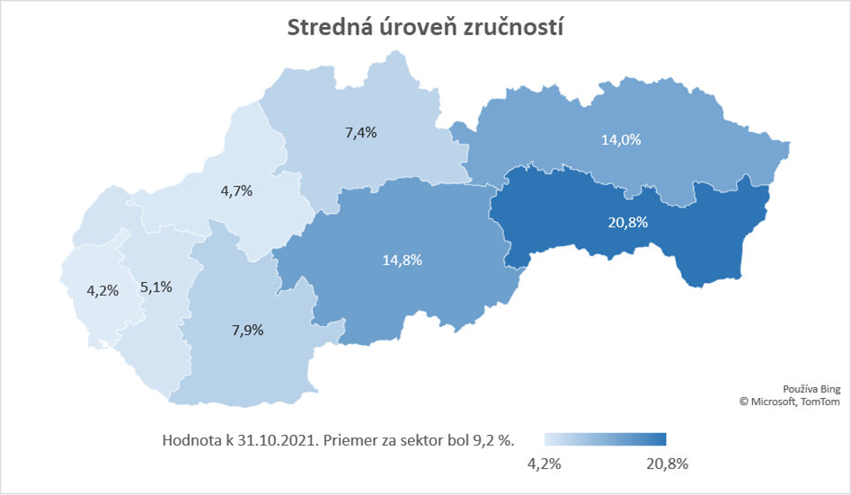 Miera sektorovo špecifickej nezamestnanosti na strednej úrovni zručností v sektore remeslá a osobné služby v regionálnom členení podľa krajov v SR k 31. 10. 2021