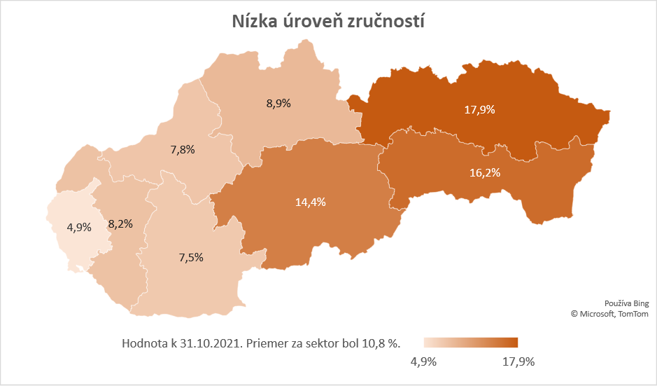 Sektor remeslá a osobné služby sa vyznačoval približne 59 %-ným zastúpením zamestnancov s pracovnými činnosťami na nízkej úrovni zručností z celkového počtu sektorovo špecifických zamestnancov a táto zručnostná kategória predstavovala aj najpočetnejšiu časť sektorovo špecifických UoZ. K 31. 10. 2021 tvorili osoby s predchádzajúcimi pracovnými úlohami na nízkej úrovni zručností približne 63 % z celkového počtu sektorovo špecifických UoZ. Najmenej sektorovo špecifických UoZ bolo s predchádzajúcou sektorovou praxou na vysokej úrovni zručností, a to len cca 1 %. U osôb s vysokými zručnosťami bola miera sektorovo špecifickej nezamestnanosti približne 16 %, pretože z celkového počtu osôb, ktoré vykonávali sektorovo špecifické zamestnania s vysokou úrovňou zručností, či už aktuálne k 31. 10. 2021 alebo bezprostredne pred ich zaradením do evidencie UoZ, tvorili UoZ 16 %. Najvýraznejšie sa na tom podieľalo sektorovo špecifické zamestnanie Prekladateľ cudzích jazykov. V prípade strednej úrovne zručností bola miera sektorovo špecifickej nezamestnanosti k 31.10. 2021 približne na úrovni 9 % a na nízkej úrovni zručností to bolo cca 11 %. V čase pandémie boli sektorovo špecifickou nezamestnanosťou najviac zasiahnuté Košický, Prešovský a Banskobystrický kraj, pričom značný vplyv na situáciu v týchto krajoch mal aj návrat do miesta trvalého pobytu u tých osôb, ktoré boli z práce uvoľnené v inom regióne, vrátane zahraničných lokalít.