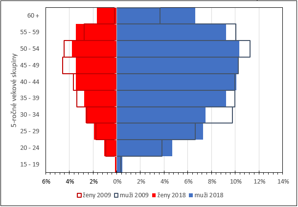 Porovnanie vekovej pyramídy mužov a žien zamestnaných v rámci sektora sklo, keramika, minerálne výrobky, nekovové materiály za roky 2009 a 2018