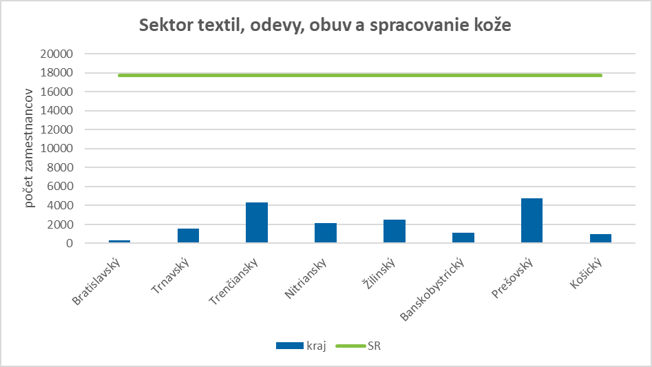 Sektor textil, odevy, obuv a spracovanie kože bol charakteristický približne 26 %-ným (viac ako 4 700 osôb) zastúpením Prešovského kraja na celkovom počte sektorovo špecifických zamestnancov v SR. Takmer 24 % sektorovo špecifických pracovných príležitostí sa využilo v Trenčianskom kraji. Medzi regiónmi najnižší podiel sektorovo špecifických zamestnancov vykázal k 31. 12. 2021 Bratislavský kraj.