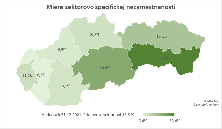 Miera sektorovo špecifickej nezamestnanosti bola v troch krajoch SR vyššia, ako bola jej celoštátna priemerná hodnota v rámci sektora, pričom situáciu v krajoch ovplyvnila taktiež návratová mobilita osôb, ktoré boli z práce uvoľnené v inom regióne, vrátane zahraničia. V sektore textil, odevy, obuv a spracovanie kože bola najvýraznejšia miera sektorovo špecifickej nezamestnanosti zaznamenaná k 31. 12. 2021 v Košickom kraji, kde dosiahla približne 38 %. Jej druhá najvyššia hodnota bola v Banskobystrickom kraji, a to cca 27 %. V opačnom spektre sa nachádzal Trnavský kraj, kde bola najnižšia miera sektorovo špecifickej nezamestnanosti, a to cca 6 %. Nízka hodnota sledovaného ukazovateľa bola aj v Trenčianskom kraji, a to necelých 9 %.