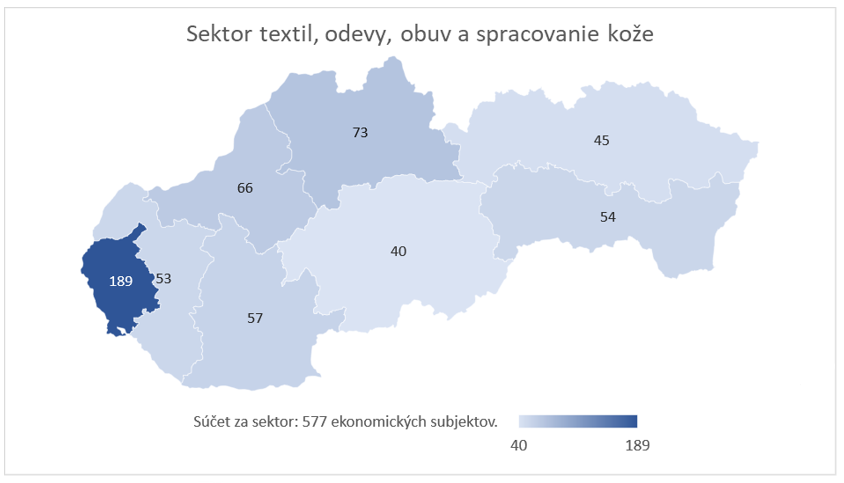 V priebehu ukončeného kalendárneho roku 2021 vzniklo v sektore textil, odevy, obuv a spracovanie kože v rámci celej SR približne 580 ekonomických subjektov. Rozhodnutie o založení nového subjektu bolo koncentrované najmä v rámci Bratislavského a Žilinského kraja. Tieto dva regióny boli charakteristické približne 33 %-ným, resp. 13 %-ným zastúpením na celkovom počte ekonomických subjektov, ktoré vznikli v SR v sektore textil, odevy, obuv a spracovanie kože v roku 2021. Medzi regiónmi najnižšie podiely na vzniku sektorovo špecifických ekonomických subjektov vykázali Banskobystrický a Prešovský kraj, a to s početnosťou približne 40, resp. 50 novovzniknutých subjektov.