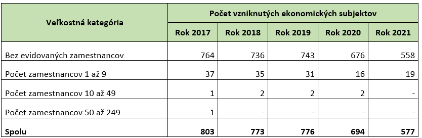 Z aspektu kombinácie časového (kalendárny rok) a veľkostného hľadiska (počet zamestnancov) vzniku ekonomických subjektov v období rokov 2017 až 2021 pribudlo v sektore najviac trhových aktérov na začiatku sledovaného obdobia, (t. j. v roku 2017) vo veľkostnej kategórii bez evidovaných zamestnancov, a to približne 760 ekonomických subjektov. Výrazný vznik ekonomických subjektov v tejto veľkostnej kategórii bol v rámci sektora zaznamenaný aj v roku 2019, a to približne 740 ekonomických subjektov. Naopak, najnižšou dynamikou sa vyznačovali ostatné roky 2021 a 2020.