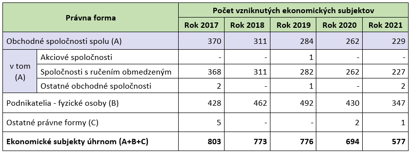 Z pohľadu kombinácie časového (kalendárny rok) a vecného hľadiska (právna forma) vzniku ekonomických subjektov v rokoch 2017 až 2021 vznikol najvyšší počet (a to cca 490 ekonomických subjektov) v roku 2019 prostredníctvom podnikateľov-fyzických osôb. Podobná intenzita vzniku ekonomických subjektov v textile, odevoch, obuvi a spracovaní kože bola zaznamenaná v tejto právnej forme podnikania vo vlastnom mene a na vlastnú zodpovednosť taktiež v roku 2018. Obchodných spoločností vzniklo najviac v roku 2017 (a to 370 subjektov), z toho takmer všetky boli spoločnosti s ručením obmedzeným.