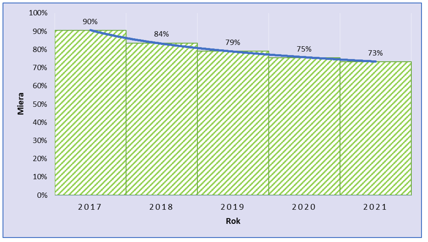 Zo všetkých ekonomických subjektov (t. j. 100 %), ktoré vznikli v sektore textil, odevy, obuv a spracovanie kože v roku 2017, ich približne 90 % pôsobilo na trhu aj ku koncu roku 2017, t. j. k termínu 31. 12. 2017. Čiže približne 10 % ekonomických subjektov, ktoré vznikli v roku 2017, ukončilo svoju činnosť ešte do konca roku 2017 (rok 2017 bol súčasne rokom ich vzniku aj zániku). Z ekonomických subjektov, ktoré vznikli v sektore textil, odevy, obuv a spracovanie kože v roku 2017, ich naďalej aj ku koncu roku 2018, t. j. k 31. 12. 2018, pôsobilo približne 84 %. Ku koncu roku 2019 aj naďalej pôsobilo približne 79 % ekonomických subjektov, ktoré vznikli v sektore v roku 2017. Postupne miera prežitia ekonomických subjektov bola na úrovni 75 % v roku 2020 a 73 % v roku 2021. Na základe rozboru vývoja v náročnom období rokov 2017 až 2021 tak možno vyvodiť sektorovo špecifický záver, že zo 100 ekonomických subjektov vzniknutých v rámci sektora textil, odevy, obuv a spracovanie kože v roku 2017, ich 73 naďalej pôsobilo aj k 31. 12. 2021.