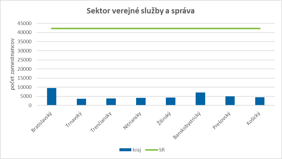 Sektor verejné služby a správa bol k 31. 12. 2021 charakteristický približne 23 %-ným (viac ako 9 500 osôb) zastúpením Bratislavského kraja na celkovom počte sektorovo špecifických zamestnancov v SR, cca 17 % (viac ako 7 000 osôb) sektorovo špecifických pracovných príležitostí sa využilo v Banskobystrickom kraji, nasledovanom Prešovským a Košickým krajom. Medzi regiónmi SR najnižší podiel sektorovo špecifických zamestnancov vykázal Trnavský kraj, a to približne 8 % z úhrnného počtu sektorovo špecifických zamestnancov vo verejných službách a správe.