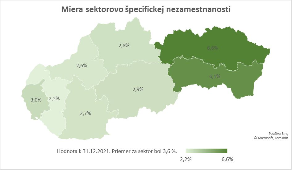 Z regionálneho hľadiska bola miera sektorovo špecifickej nezamestnanosti na východe SR vyššia, ako bola jej celoštátna priemerná hodnota v rámci sektora, pričom situáciu v krajoch ovplyvnila taktiež návratová mobilita osôb, ktoré boli z práce uvoľnené v inom regióne, vrátane zahraničia. V sektore bola najvýraznejšia miera sektorovo špecifickej nezamestnanosti k 31. 12. 2021 zaznamenaná v Prešovskom kraji, kde dosiahla približne 7 %. V opačnom spektre sa nachádzal Trnavský kraj, kde bola zaznamenaná miera sektorovo špecifickej nezamestnanosti na úrovni približne 2 %.
