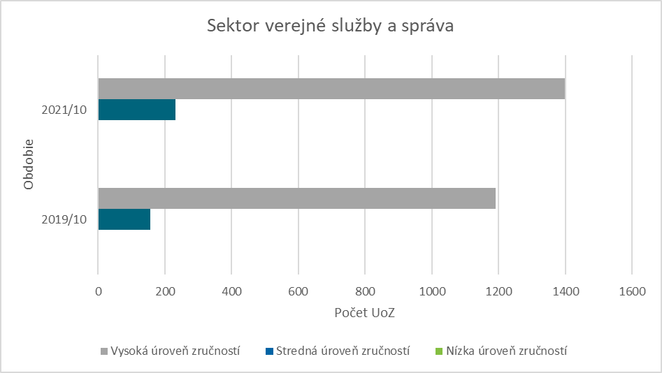 V sledovanom období od 31. 10. 2019 do 31. 10. 2021 sa v sektore verejné služby a správa počet sektorovo špecifických UoZ s predchádzajúcim zamestnaním na väčšinovej, t. j. na vysokej úrovni zručností, zvýšil približne o 200 osôb, t. j. o 17 %. Počet UoZ s predchádzajúcim zamestnaním na strednej úrovni zručností sa zvýšil približne o 70 osôb, t. j. o 47 % východiskového stavu.