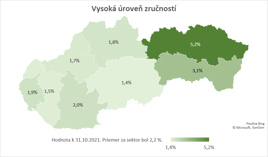 V prevažnej kategórii ľudských zdrojov, t. j. s vysokými zručnosťami, bola miera sektorovo špecifickej nezamestnanosti na úrovni približne 2 %, pretože z celkového počtu osôb, ktoré vykonávali sektorovo špecifické zamestnania s vysokou úrovňou zručností, či už aktuálne k 31. 10. 2021 alebo bezprostredne pred zaradením do evidencie UoZ, tvorili UoZ cca 2 %. V prípade strednej úrovne zručností bola miera sektorovo špecifickej nezamestnanosti k 31. 10. 2021 mierne vyššia, ako tomu bolo na vysokej úrovni zručností, a to necelé 4 %.