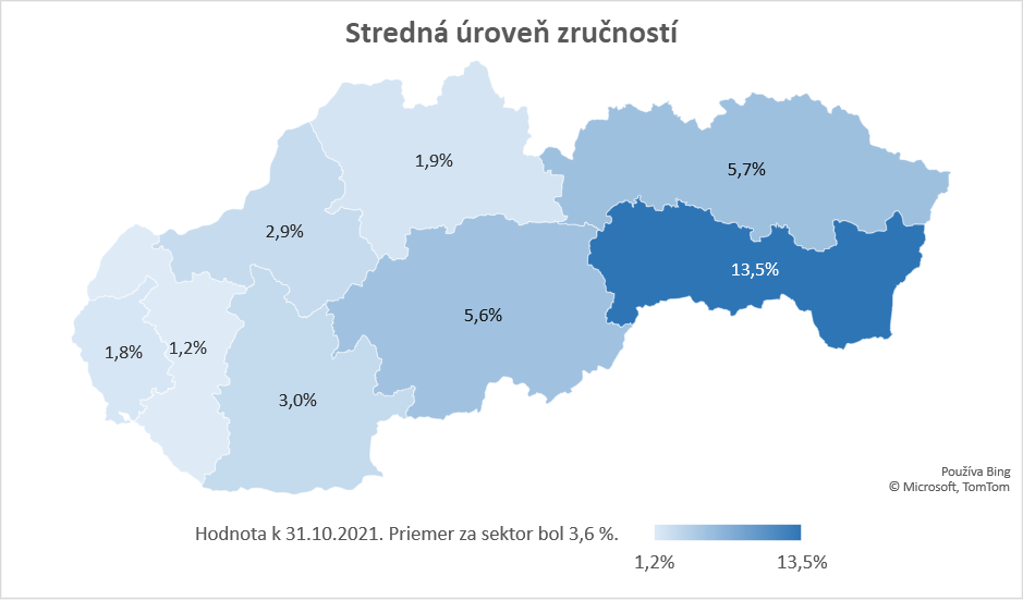 Miera sektorovo špecifickej nezamestnanosti na strednej úrovni zručností v sektore verejné služby a správa v regionálnom členení podľa krajov v SR k 31. 10. 2021