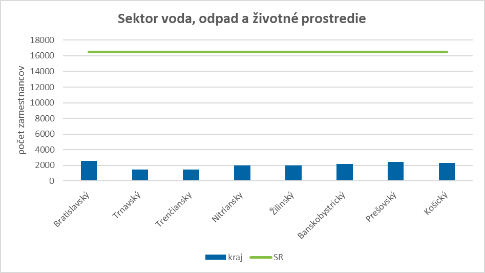 Sektor voda, odpad a životné prostredie bol charakteristický približne 16 %-ným (viac ako 2 600 osôb) zastúpením Bratislavského kraja na celkovom počte sektorovo špecifických zamestnancov v SR. Približne 15 % sektorovo špecifických pracovných príležitostí sa využilo v Košickom kraji, ako aj v Prešovskom kraji. Medzi regiónmi najnižší podiel sektorovo špecifických zamestnancov vykázali k 31. 12. 2021 Trnavský kraj a Trenčiansky kraj, a to cca 9 % z úhrnného počtu sektorovo špecifických zamestnancov.