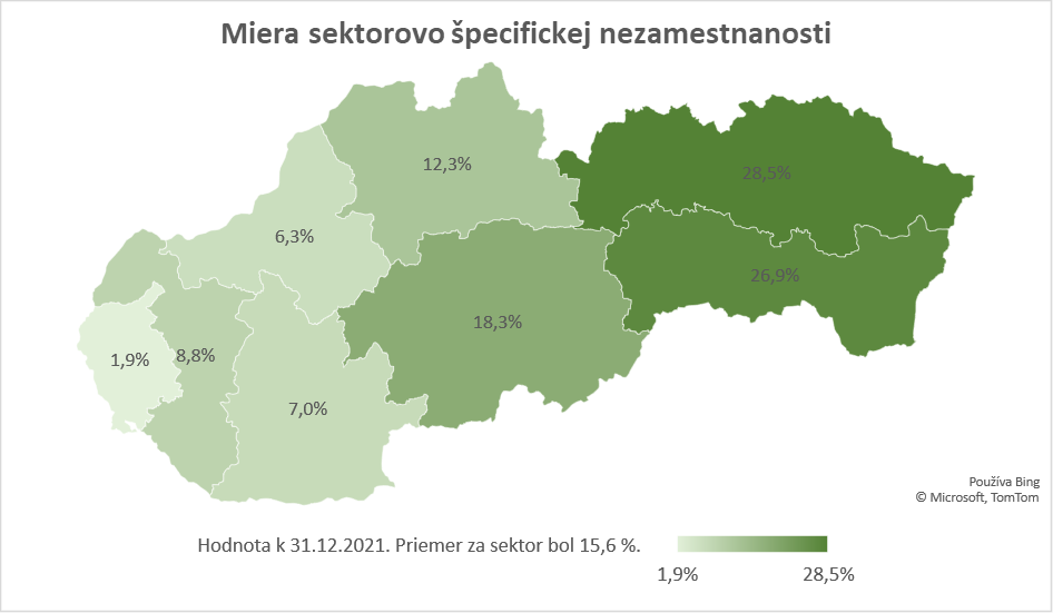 Miera sektorovo špecifickej nezamestnanosti bola v troch krajoch SR vyššia, ako bola jej celoštátna priemerná hodnota v rámci sektora, pričom situáciu v krajoch ovplyvnila taktiež návratová mobilita osôb, ktoré boli z práce uvoľnené v inom regióne, vrátane zahraničia. V sektore voda, odpad a životné prostredie bola najvýraznejšia miera sektorovo špecifickej nezamestnanosti k 31. 12. 2021 zaznamenaná v Prešovskom kraji, kde dosiahla takmer 29 %. V opačnom spektre bol na čele Bratislavský kraj, kde bola zaznamenaná miera sektorovo špecifickej nezamestnanosti menej ako 2 %.