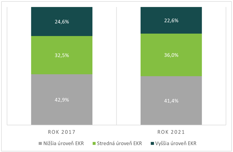 Počas uplynulých piatich rokov, t. j. medzi rokmi 2017 a 2021, najvýraznejšia zmena v štruktúre sektorovo špecifických zamestnancov nastala na strednej úrovni EKR, kde prišlo k zvýšeniu podielu sektorovo špecifických zamestnancov o cca 3,5 p. b. Na druhej strane, podiel zamestnancov s vyššou úrovňou EKR sa znížil o 2 p. b.