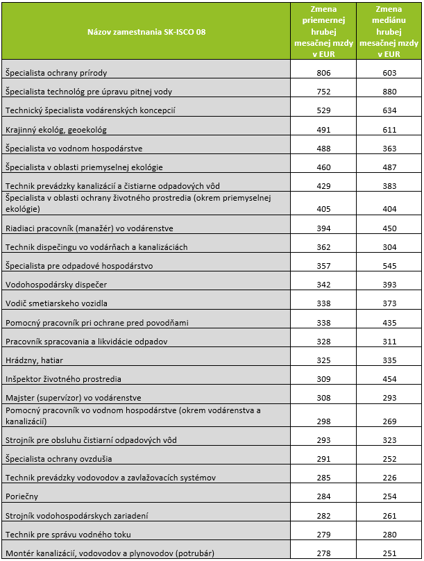 Z hľadiska zmeny priemernej hrubej mesačnej mzdy v peňažných jednotkách, t. j. v EUR, bola v rozmedzí rokov 2017 a 2021 spomedzi sektorovo špecifických zamestnaní identifikovaná najvyššia zmena na úrovni 806 EUR v zamestnaní Špecialista ochrany prírody. Druhé najvyššie zvýšenie miezd v sektore voda, odpad a životné prostredie bolo medzi rokmi 2017 a 2021 zaznamenané v prípade zamestnania Špecialista technológ pre úpravu pitnej vody, kde príslušný nárast predstavoval 752 EUR. Na treťom mieste boli zamestnanci evidovaní v zamestnaní Technický špecialista vodárenských koncepcií, a to so zvýšením mzdy v priemere o 529 EUR. Výrazné zvýšenie miezd v rámci sektora bolo aj pri zamestnaniach Krajinný ekológ, geoekológ (o 491 EUR) a Špecialista vo vodnom hospodárstve (o 488 EUR).