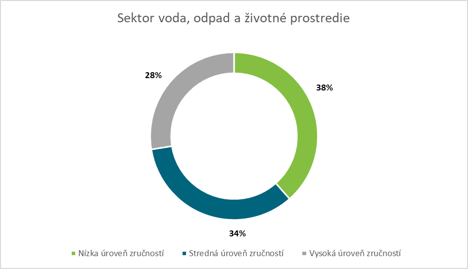 Sektor voda, odpad a životné prostredie bol charakteristický približne 38 %-ným zastúpením sektorovo špecifických zamestnancov uplatňujúcich na pracovných miestach nízku úroveň zručností. Približne 34 % sektorovo špecifických pracovných príležitostí si vyžadovalo strednú úroveň zručností a vysokú úroveň zručností uplatňovalo približne 28 % sektorovo špecifických zamestnancov.