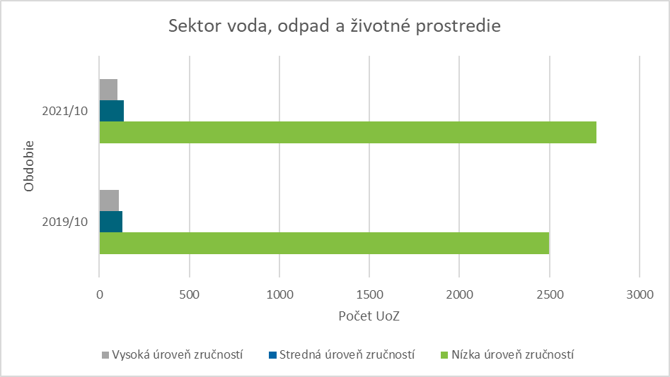 Počet UoZ s predchádzajúcim vykonávaným zamestnaním typickým pre sektor voda, odpad a životné prostredie pod vplyvom pandémie COVID-19 od 31. 10. 2019 do 31. 10. 2021 vzrástol cca o 270 osôb, t. j. o 10 %. Sektorovo špecifickí zamestnanci vykonávali prevažne pracovné činnosti vyžadujúce nízku úroveň zručností a taktiež najvyšší počet sektorovo špecifických UoZ vykonával bezprostredne pred zaradením do evidencie UoZ zamestnania, ktoré si vyžadovali túto zručnostnú úroveň. Z celkového počtu sektorovo špecifických UoZ ich bolo približne 92 %. Najmenej sektorovo špecifických UoZ bolo s predchádzajúcou praxou na vysokej úrovni zručností, a to iba necelé 3 %. Na strednej úrovni zručností išlo približne o 5 %.