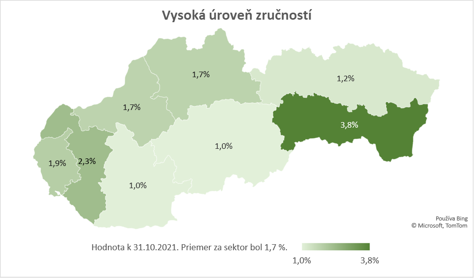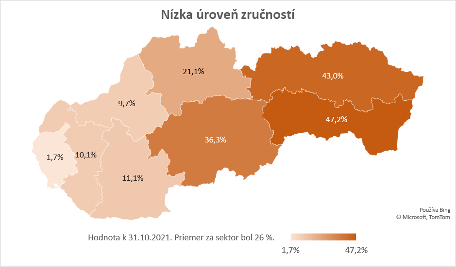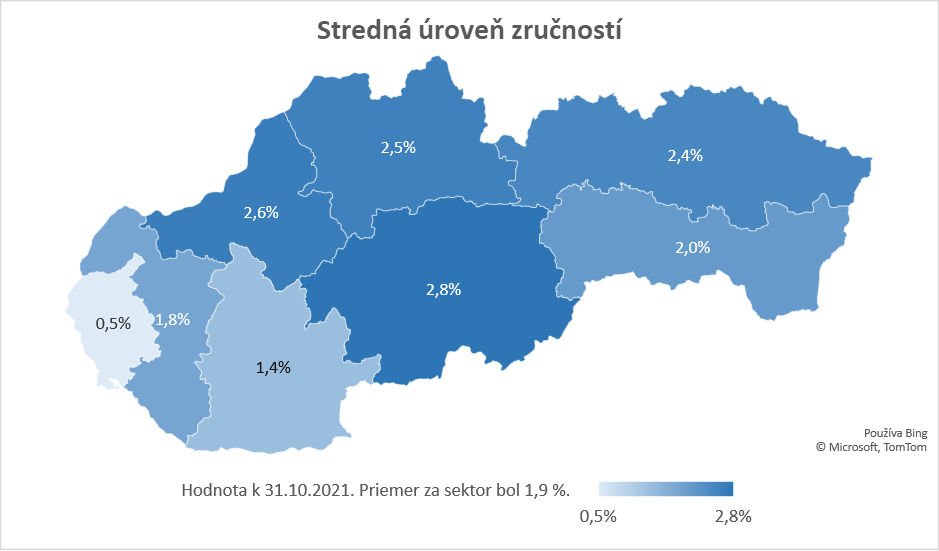 v rámci sektora. Najvyššia miera sektorovo špecifickej nezamestnanosti na danej úrovni zručností bola zaznamenaná v Košickom kraji, kde atakovala 4 %. Jej druhá najvyššia hodnota bola v Trnavskom kraji, a to viac ako 2 %. V opačnom spektre sa nachádzal Nitriansky a Banskobystrický kraj, v ktorých miera sektorovo špecifickej nezamestnanosti na vysokej úrovni zručností nepresiahla 1 %. Špecifická nezamestnanosť v sektore voda, odpad a životné prostredie sa v prípade vysokej úrovne zručností v období od 31. 10. 2019 do 31. 10. 2021 zmenila len minimálne, zvýšenie počtu sektorovo špecifických UoZ bolo zaznamenané v zamestnaní Špecialista v oblasti ochrany životného prostredia (okrem priemyselnej ekológie).