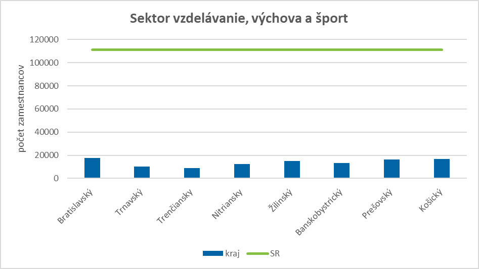 Sektor vzdelávanie, výchova a šport bol k 31. 12. 2021 charakteristický približne 16 %-ným (viac ako 18 000 osôb) zastúpením Bratislavského kraja na celkovom počte sektorovo špecifických zamestnancov v SR, cca 15 % sektorovo špecifických pracovných príležitostí sa využilo v Košickom kraji, nasledovanom Prešovským a Žilinským krajom. Medzi regiónmi SR najnižší podiel sektorovo špecifických zamestnancov vykázal Trenčiansky kraj, a to približne 8 % z úhrnného počtu sektorovo špecifických zamestnancov vo vzdelávaní, výchove a športe.