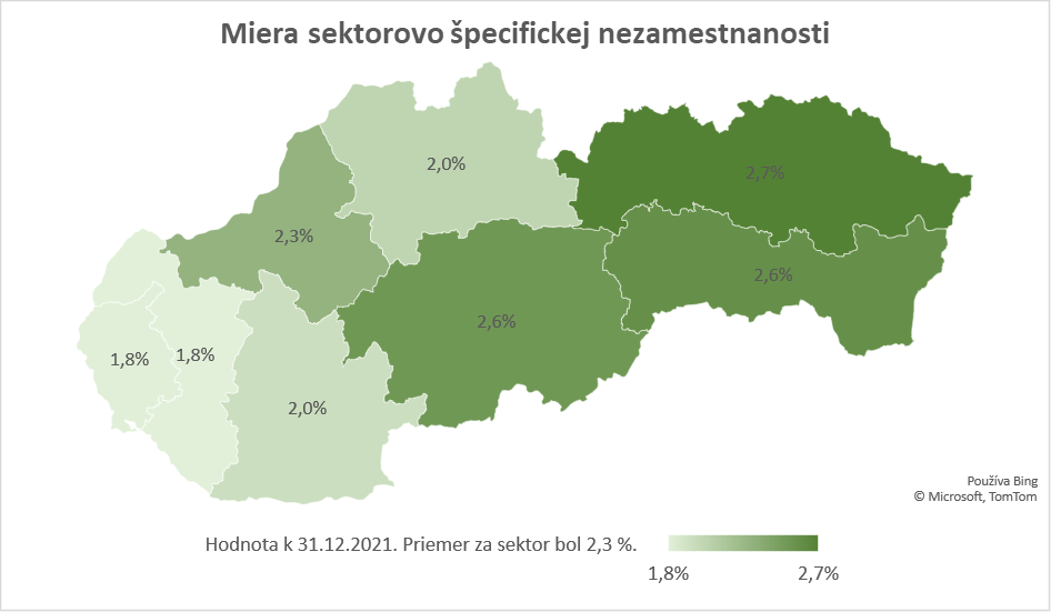 Miera sektorovo špecifickej nezamestnanosti bola v štyroch krajoch SR vyššia, ako bola jej celoštátna priemerná hodnota v rámci sektora, pričom situáciu v krajoch ovplyvnila taktiež návratová mobilita osôb, ktoré boli z práce uvoľnené v inom regióne, vrátane zahraničia. V sektore bola najvýraznejšia miera sektorovo špecifickej nezamestnanosti k 31. 12. 2021 zaznamenaná v Prešovskom kraji, kde dosiahla približne 3 %. V opačnom spektre sa nachádzali Bratislavský a Trnavský kraj, kde bola zaznamenaná miera sektorovo špecifickej nezamestnanosti na úrovni menej ako 2 %.