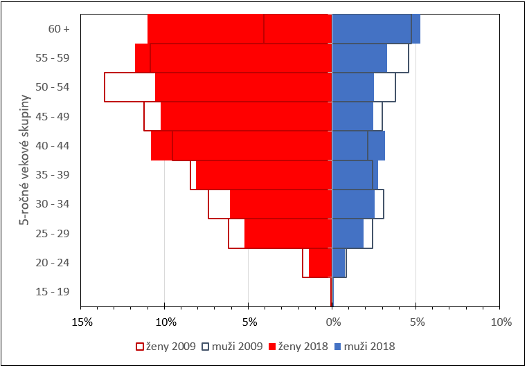 Porovnanie vekovej pyramídy mužov a žien zamestnaných v rámci sektora vzdelávania, výchovy a športu za roky 2009 a 2018