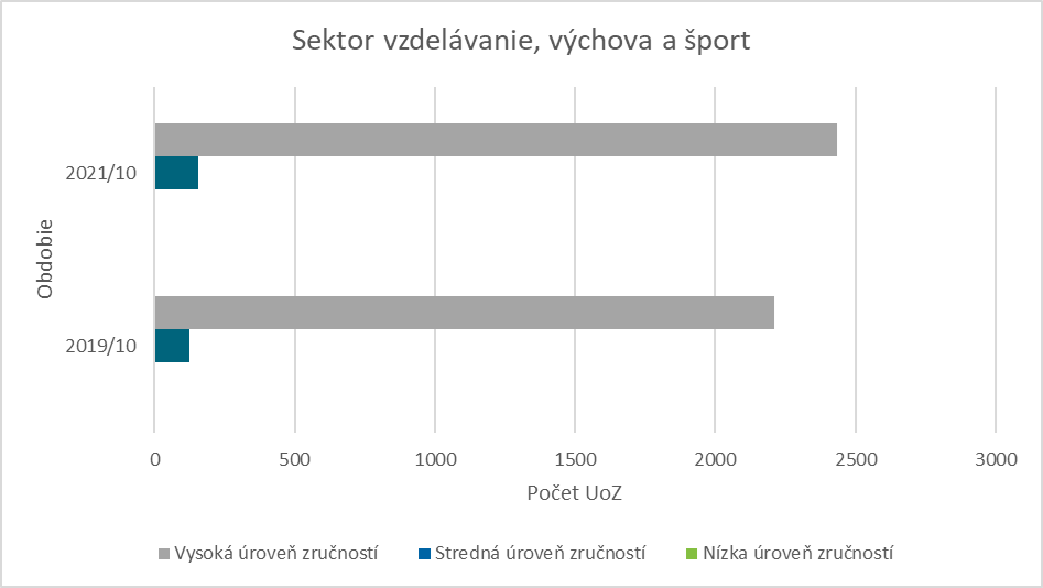 V sledovanom období od 31. 10. 2019 do 31. 10. 2021 sa v sektore vzdelávanie, výchova a šport počet sektorovo špecifických UoZ s predchádzajúcim zamestnaním na väčšinovej, t. j. na vysokej úrovni zručností, zvýšil približne o 230 osôb, t. j. o 10 %. Počet UoZ s predchádzajúcim zamestnaním na strednej úrovni zručností sa zvýšil približne o 30 osôb, t. j. o 26 % východiskového stavu.