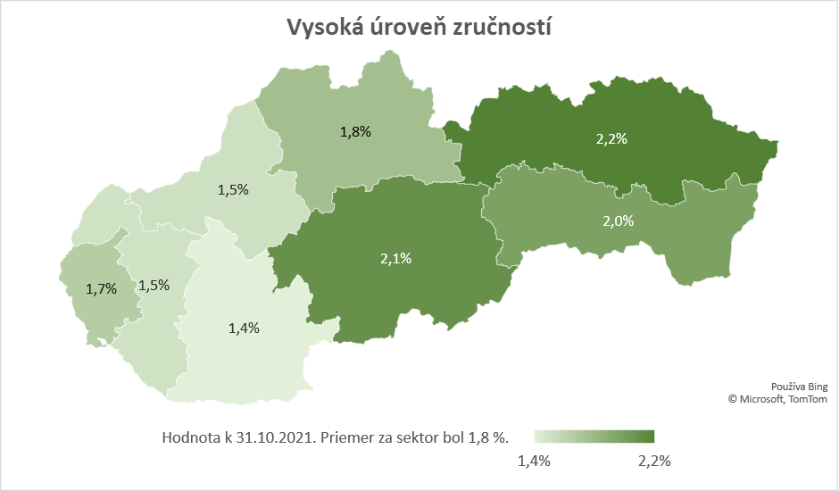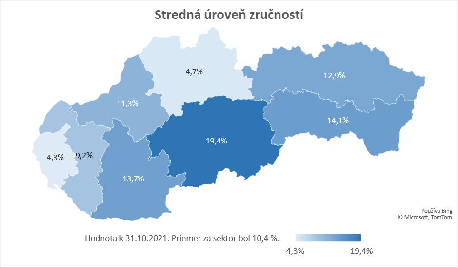 V prevažnej kategórii ľudských zdrojov, t. j. s vysokými zručnosťami, bola miera sektorovo špecifickej nezamestnanosti na úrovni 1,8 %, pretože z celkového počtu osôb, ktoré vykonávali sektorovo špecifické zamestnania s vysokou úrovňou zručností, či už aktuálne k 31. 10. 2021 alebo bezprostredne pred ich zaradením do evidencie UoZ, tvorili UoZ približne 1,8 %. V prípade strednej úrovne zručností bola miera sektorovo špecifickej nezamestnanosti k 31. 10. 2021 podstatne vyššia, ako tomu bolo na vysokej úrovni zručností, a to až 10,4 %.